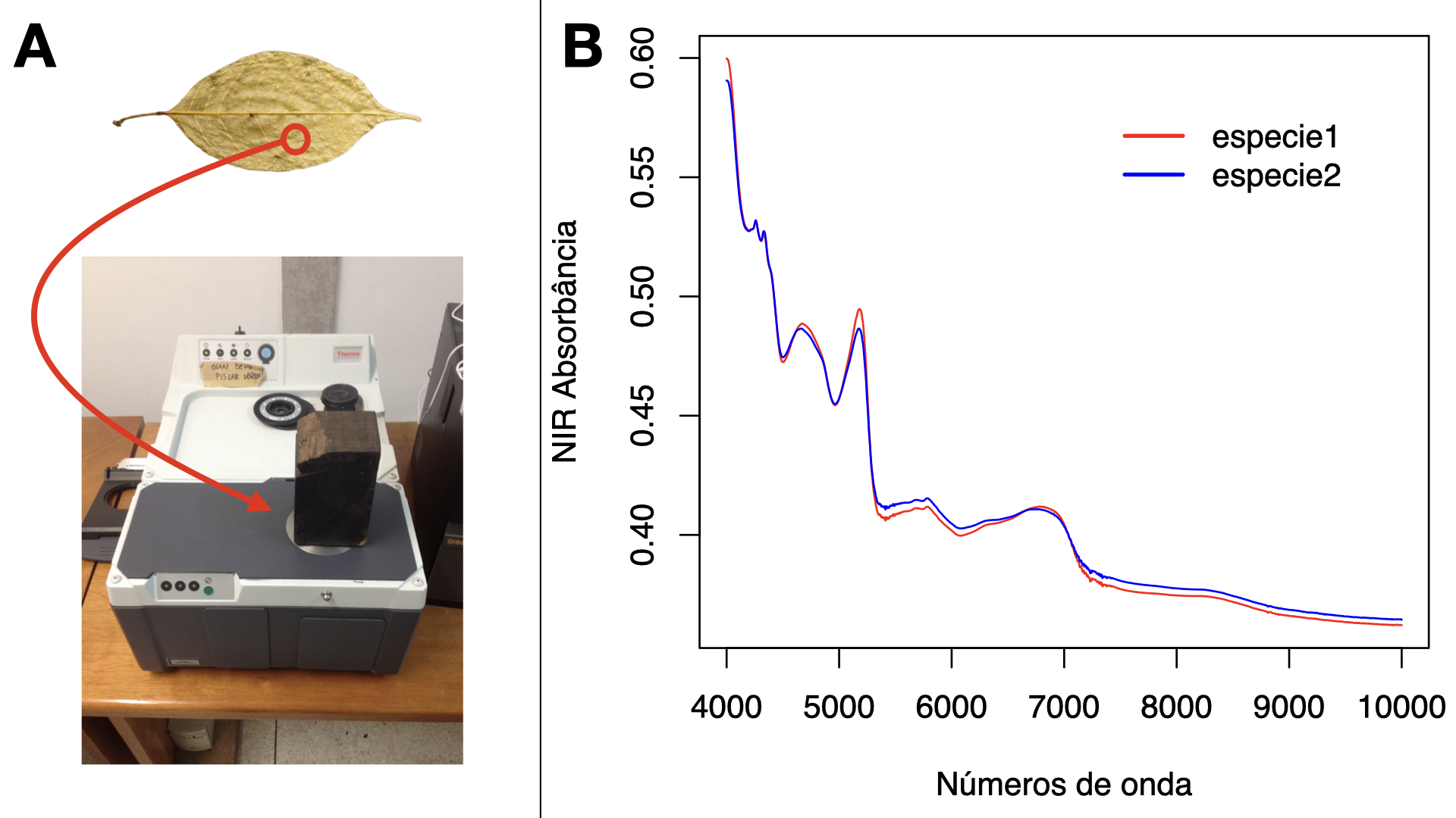 (ref:esquema) Esquema básico sobre obtenção de dados NIR e resultado prático da leitura. A. Nesta imagem na parte de baixo, observamos um equipamento em que obtemos dados NIR, modelo Antaris II da Thermo Fisher Scientific, encontrado no herbário do Instituto Nacional de Pesquisas da Amazônia (INPA). Colocamos pedaços de folhas ou bichos sobre uma região circular do aparelho (forma similar ao círculo vermelho da imagem; tamanho não correspondente ao real), que é de onde são emitidas as ondas eletromagnéticas; em seguida, é posto um corpo negro para evitar a dissipação de ondas (na imagem, percebe-se um pedaço de madeira sobre essa região, geralmente utilizado para reforçar a pressão do corpo negro sobre a amostra) para, enfim, ser realizada a emissão das ondas eletromagnéticas e posterior obtenção de uma leitura espectral. Em plantas, isso é geralmente feito nas duas faces das folhas. B. Gráfico com números de onda no eixo X, e absorbância das ondas NIR no eixo Y, para amostras referentes a duas espécies hipotéticas; nesta imagem, é possível verificar certas diferenças no padrão espectral entre essas duas espécies. Por meio de análises estatísticas multivariadas, podemos utilizar essas informações para delimitar espécies. Foto e imagens: R. O. Perdiz.
