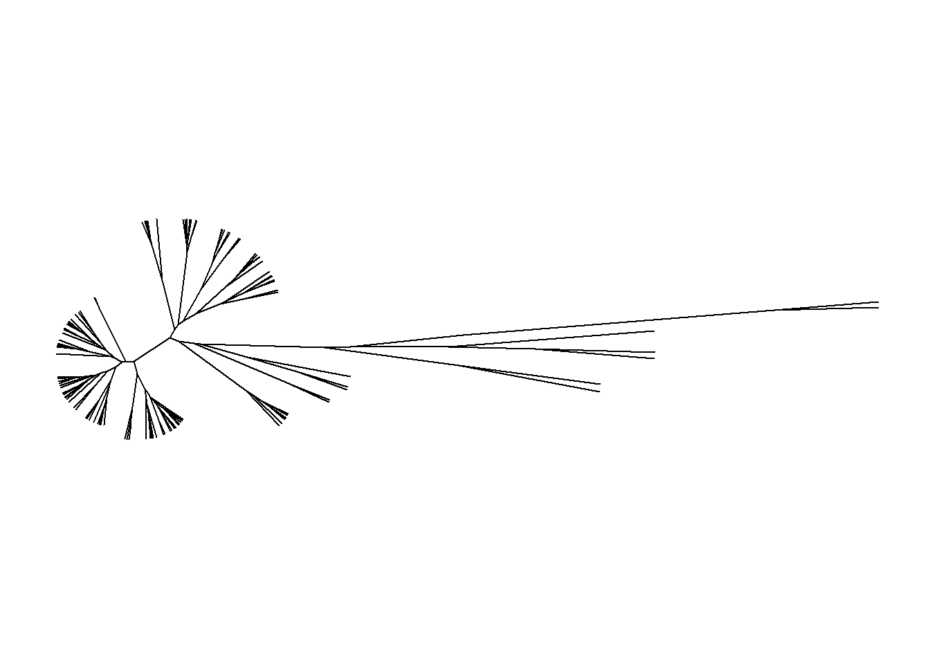 Apenas os dados referentes à árvore são retornados. Nela, vemos que a árvore está enraizada, possui tamanho dos ramos, e existem 118 terminais.