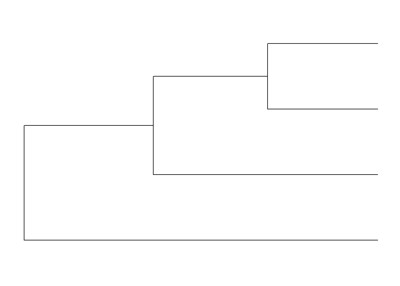 ggtree(arvore)Imediatamente, é plotada uma árvore. Por padrão, ela aparece em forma de escada (ladderized em inglês).